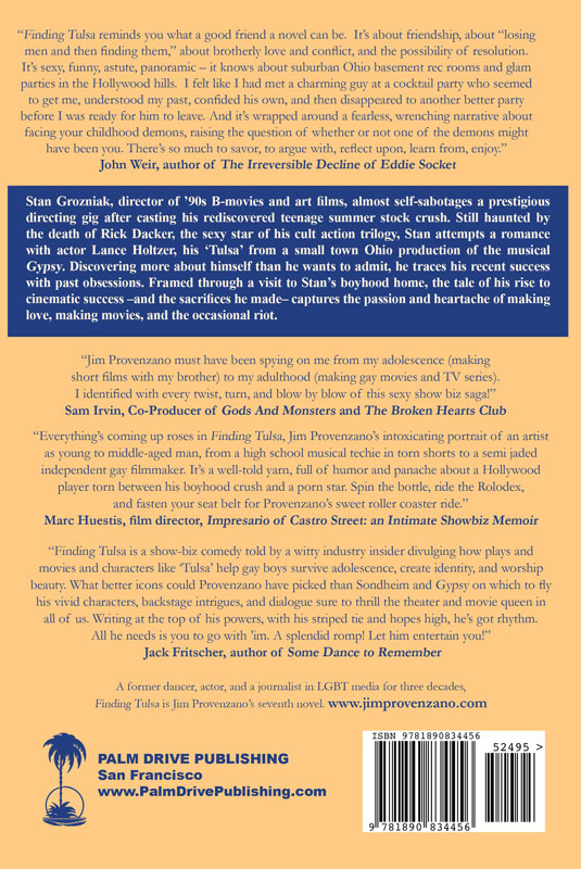 ![]() a novel by JIM PROVENZANO Available September 2020 In Finding Tulsa, Stan Grozniak, the once-rising star of 1990s gay cinema, shares how he almost self-sabotaged a prestigious directing gig after casting his rediscovered teenage summer stock crush. While still haunted by the death of Rick Dacker, the sexy star of his cult favorite action trilogy, Stan attempts a romance with actor Lance Holtzer, his ‘Tulsa’ from a small town Ohio production of the musical Gypsy. Discovering more about himself than he wants to admit, he traces his recent success with past obsessions. Framed through a visit to Stan’s boyhood home, the tale of his rise to cinematic successand the sacrifices he madecaptures the passion and heartache of making love, making movies, and the occasional riot. Advance praise for Finding Tulsa “Finding Tulsa is sexy, romantic, witty, engaging, both cleverly current yet sweetly retrospective. It's Jim Provenzano's most complex and accomplished novel. He gets so much right and so evocatively about show business, from those school plays we all remember to Hollywood made-for-television movies, with delicious stops at boyhood Super-8 movies and out of town gay porn shoots.” “Everything’s coming up roses in Finding Tulsa, Jim Provenzano’s intoxicating portrait of an artist as young to middle-aged man, from a high school musical techie in torn shorts to a semi jaded independent gay filmmaker. It’s a well-told yarn, full of humor and panache about a Hollywood player torn between his boyhood crush and a porn star. Spin the bottle, ride the Rolodex, and fasten your seat belt for Provenzano’s sweet roller coaster ride.” “Jim Provenzano must have been spying on me from my adolescence (making short films with my brother) to my adulthood (making gay movies and TV series). I identified with every twist, turn, and blow by blow of this sexy show biz saga!” “Jim Provenzano's sexy, funny and soulful new novel Finding Tulsa is a beautiful deep-end dive into the memory of desire, the thumping bass note that drives life and art. The novel gorgeously explores how our hearts and cocks are woven with our theatre and films as we figure out how to be the star of our own queer story.” “Jim Provenzano always keeps in mind what the original ‘Tulsa’ said in Gypsy: ‘This step is good for the costume.’ Provenzano never misses a step as he suavely combines aesthetics and homoerotics in a work that is throughout deeply touching.” "Lights! Camera! Action! Finding Tulsa is a show-biz comedy told by a witty industry insider divulging how plays and movies and characters like “Tulsa” help gay boys survive adolescence, create identity, and worship beauty. What better icons could Provenzano have picked than Sondheim and Gypsy on which to fly his vivid characters, backstage intrigues, and dialogue sure to thrill the theater and movie queen in all of us. Writing at the top of his powers, with his striped tie and hopes high, he’s got rhythm. All he needs is you to go with ’im. A splendid romp! Let him entertain you!" About the Author